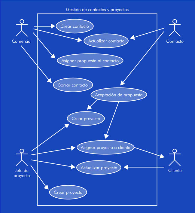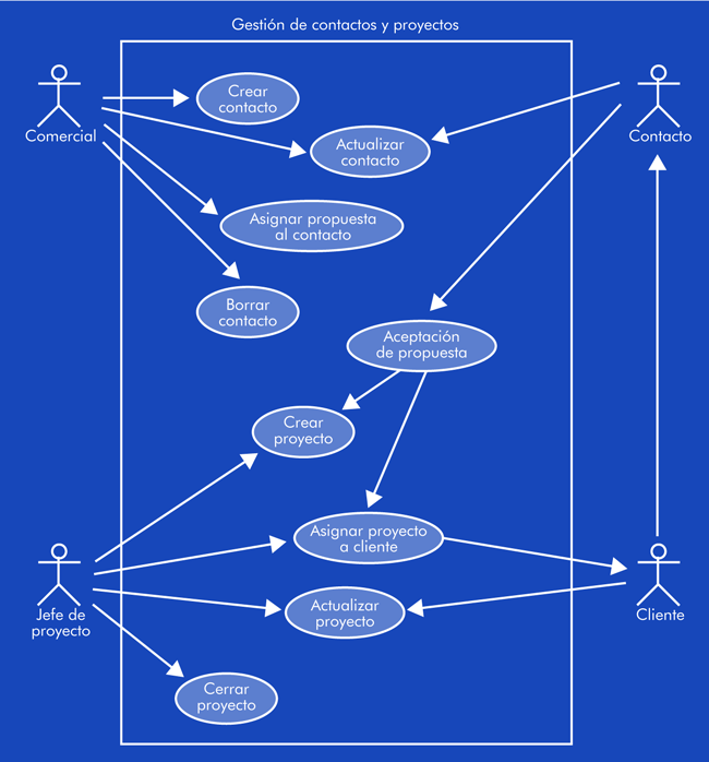 A continuación veamos una propuesta de caso de uso en el ámbito de la gestión de los contactos y proyectos.