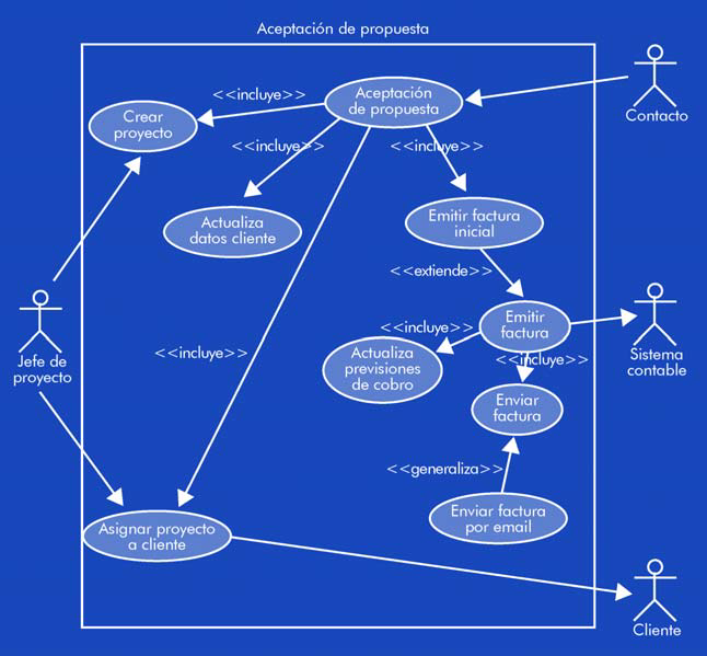 La etiqueta incluye entre dos casos de uso indica que uno tiene la funcionalidad de otro como parte integrante suya. En el ejemplo, la aceptación de la propuesta incluirá la funcionalidad para actualizar los datos del cliente (ahora tenemos un cliente en lugar de un simple contacto), emitir la factura inicial, quizá (no forzosamente)